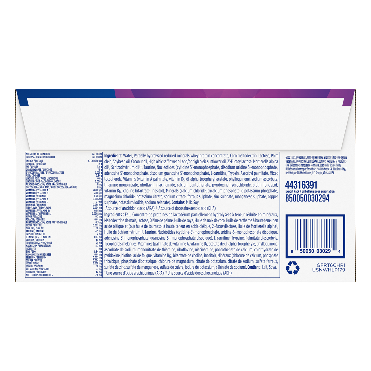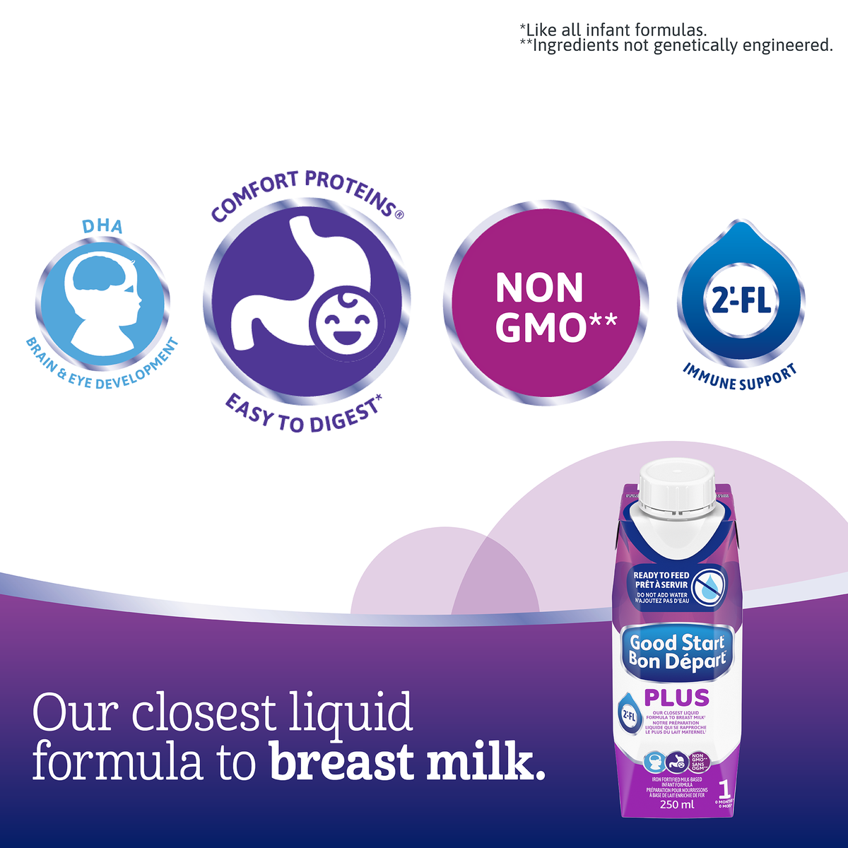 Notre préparation liquide la plus proche du lait maternel avec la combinaison de Protéines ConfortMC, de ADH et de 2'-FL. Il suffit de bien agiter, d'ouvrir et de verser dans un biberon stérilisé.