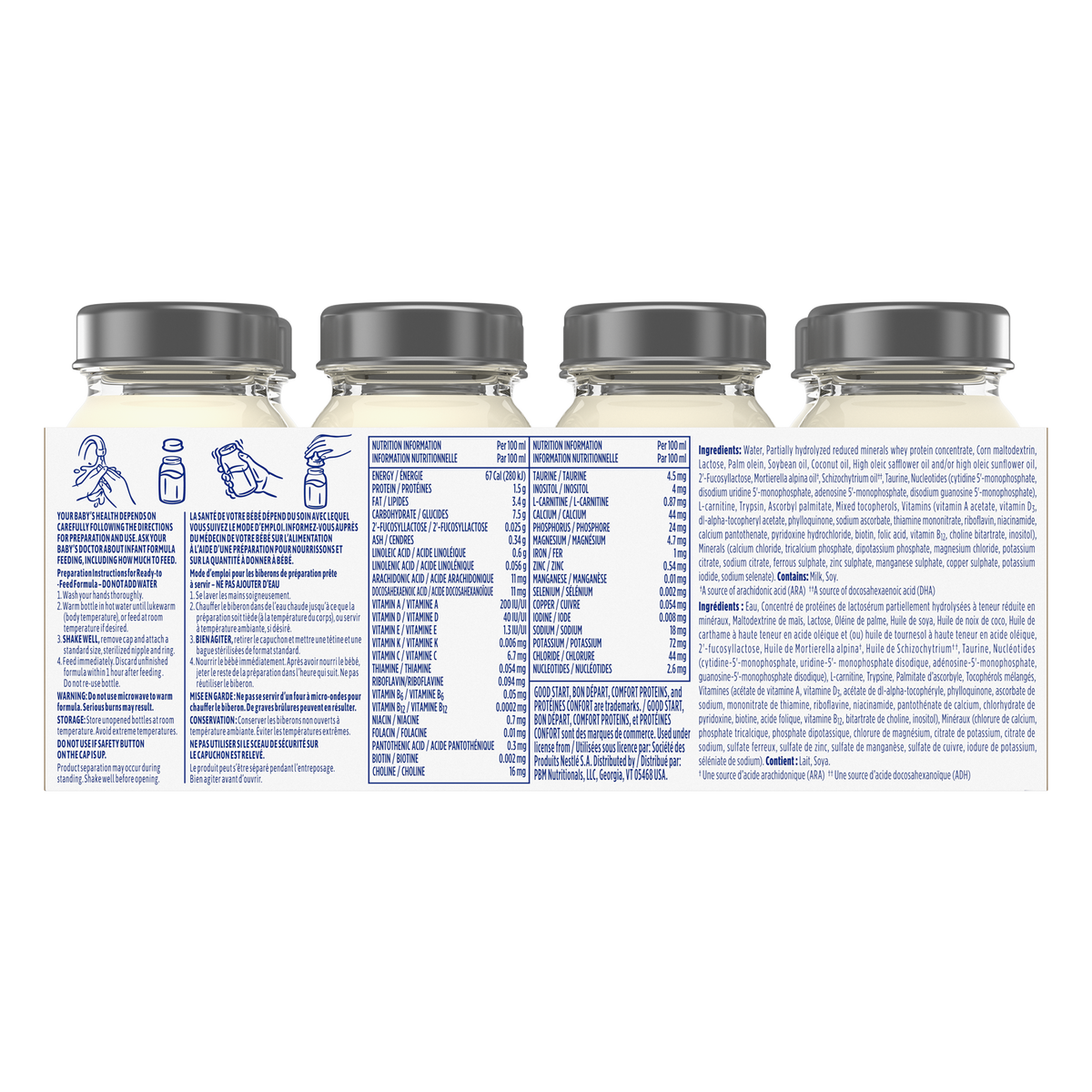 Notre préparation liquide la plus proche du lait maternel avec la combinaison de Protéines ConfortMC, d’ADH et de 2'-FL. Il suffit de bien agiter, de retirer le capuchon, de visser une tétine et un anneau stérilisés de taille standard, et le tour est joué !